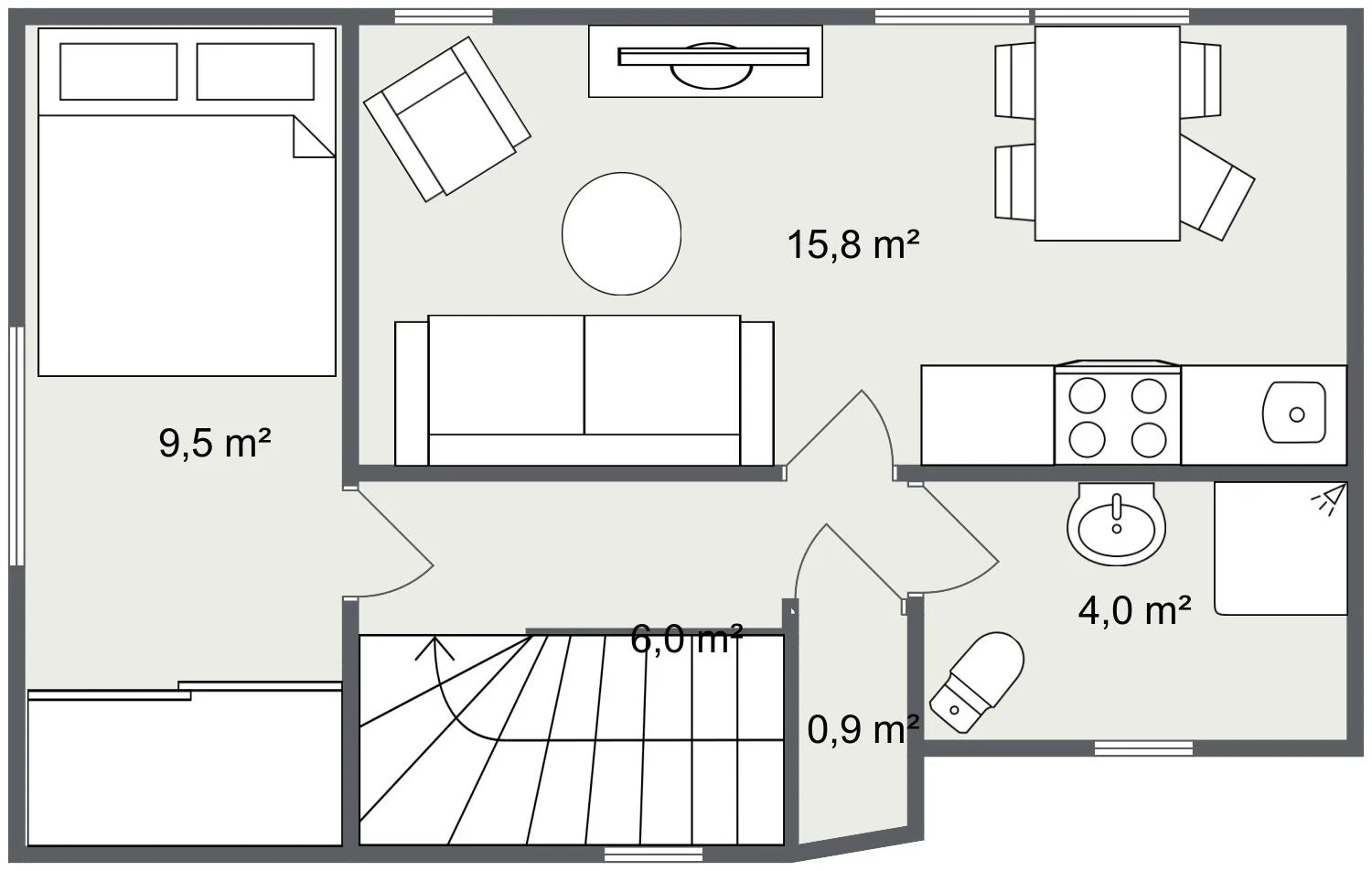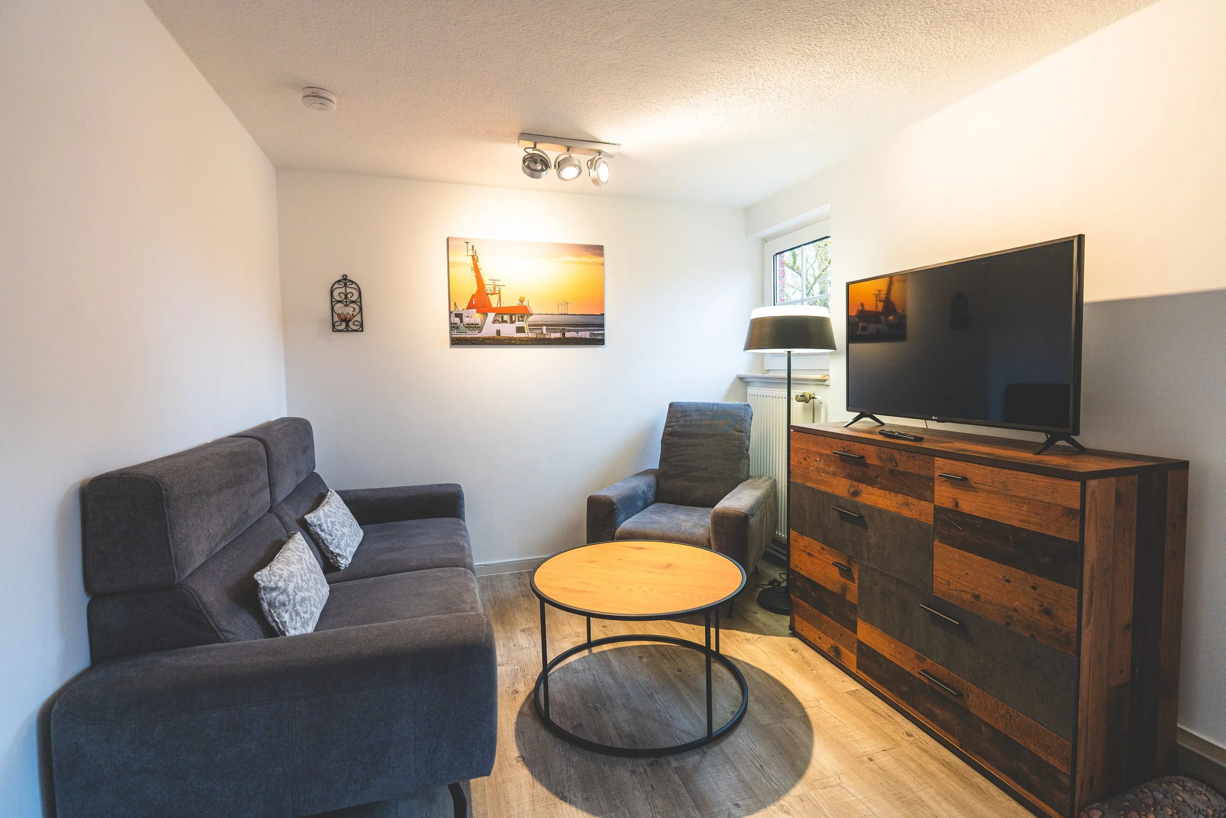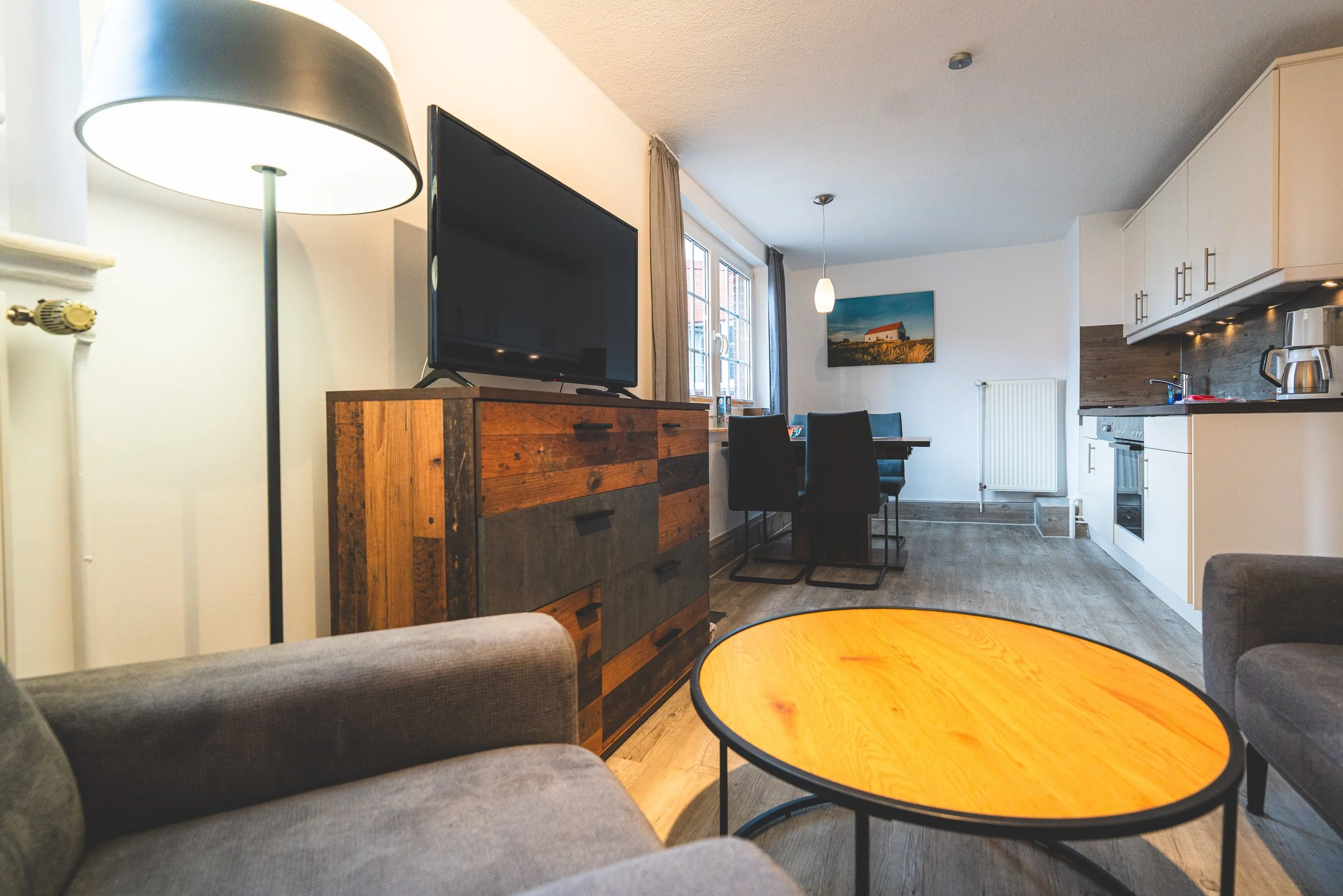 Im Wohnbereich laden Sofa, Sessel und TV zum Entspannen ein. Die Küche ist vollständig ausgestattet und verfügt über einen Essplatz für gemeinsame Mahlzeiten.