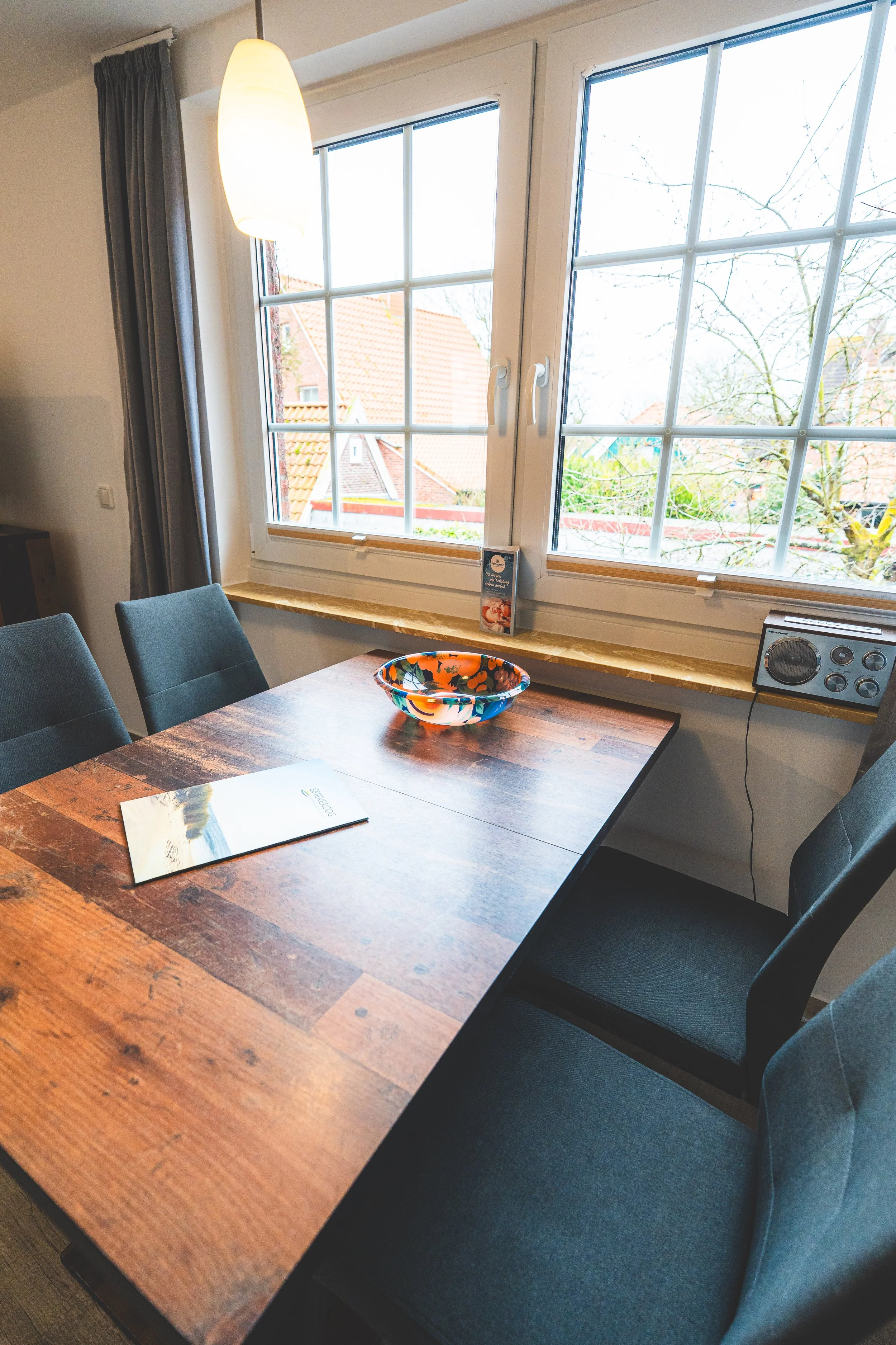 Die Ferienwohnung „Blaumeise“ erstreckt sich über zwei Etagen und bietet Platz für bis zu vier Personen. Im oberen Bereich befindet sich der Wohn- und Essbereich mit offener Küche sowie ein Schlafzimmer und ein Badezimmer. Große Fenster sorgen für viel Tageslicht und eine angenehme Atmosphäre.