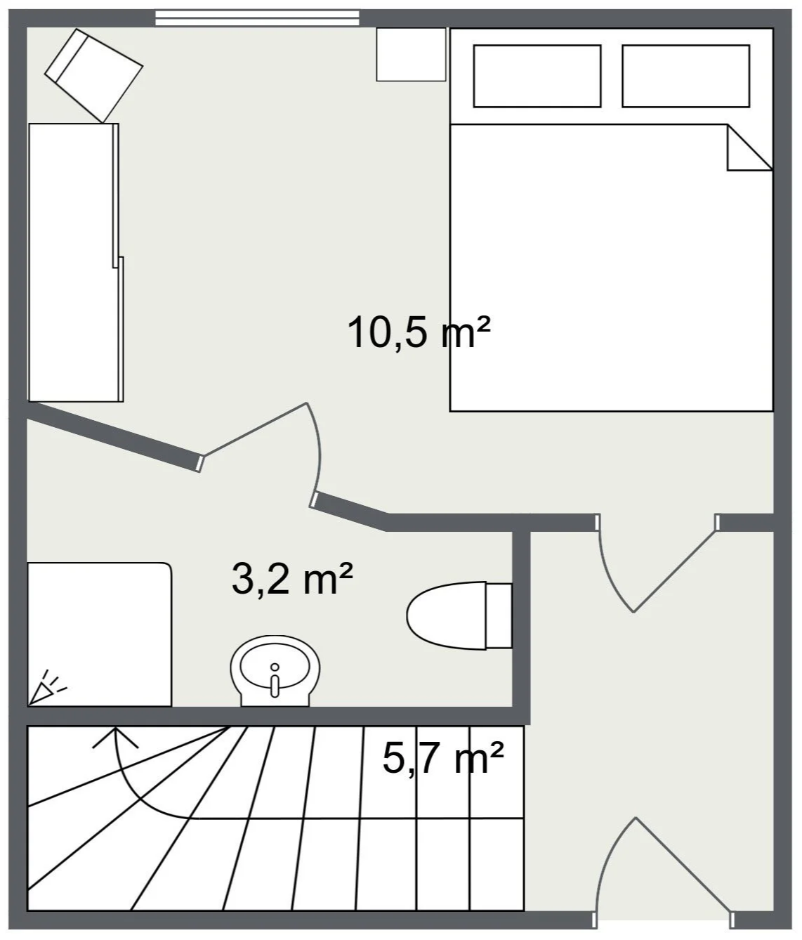 Über eine interne Treppe gelangt man in die untere Etage der Wohnung. Dort befindet sich ein weiteres Schlafzimmer sowie ein zusätzliches Badezimmer.
