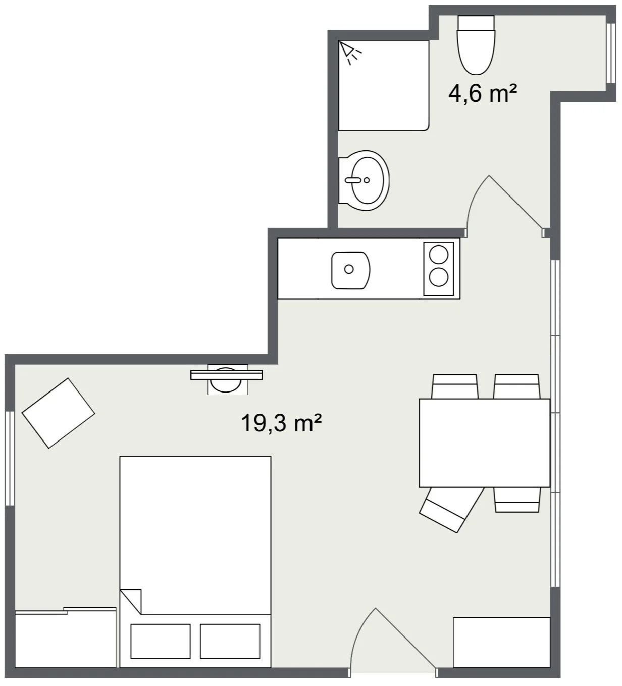 Die offene Küche verfügt über einen kleinen Essplatz am Fenster und bietet alles, was man für den täglichen Gebrauch benötigt. Das Badezimmer ist funktional eingerichtet und mit Dusche, Waschbecken und WC ausgestattet.
