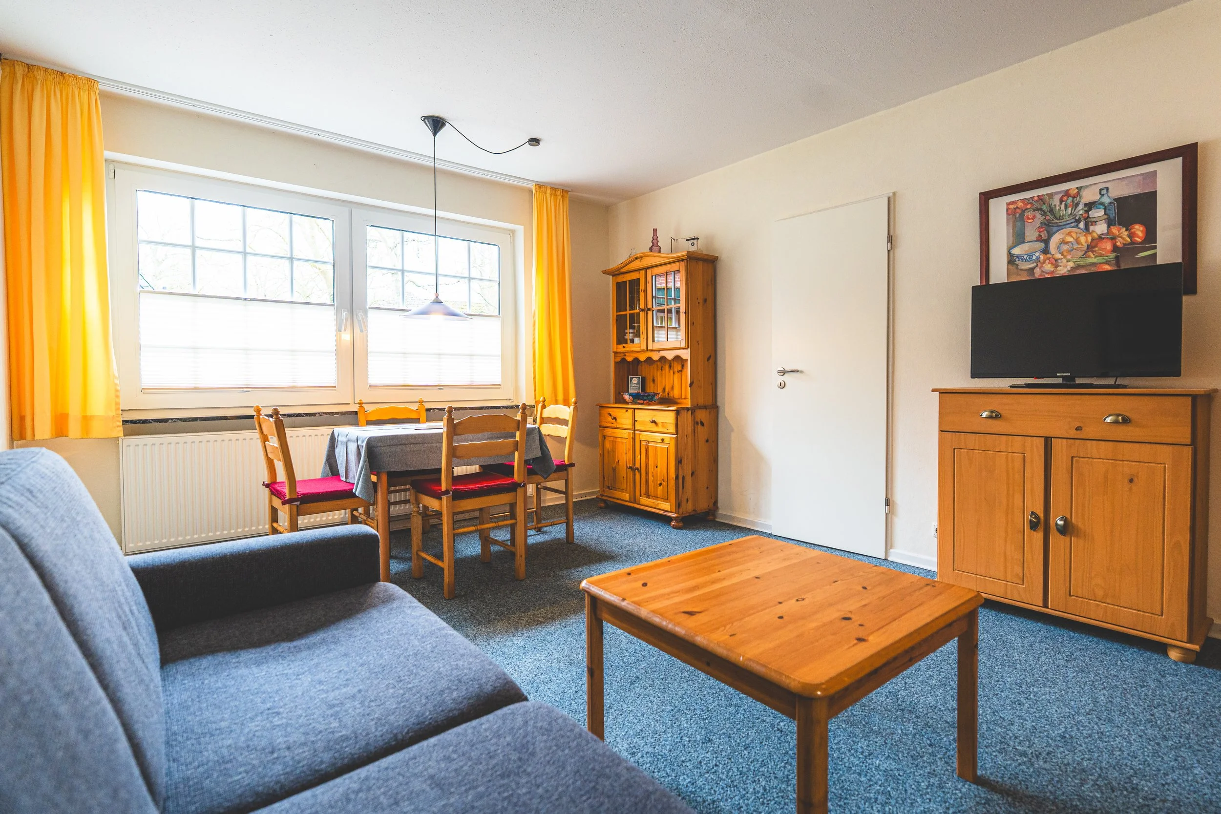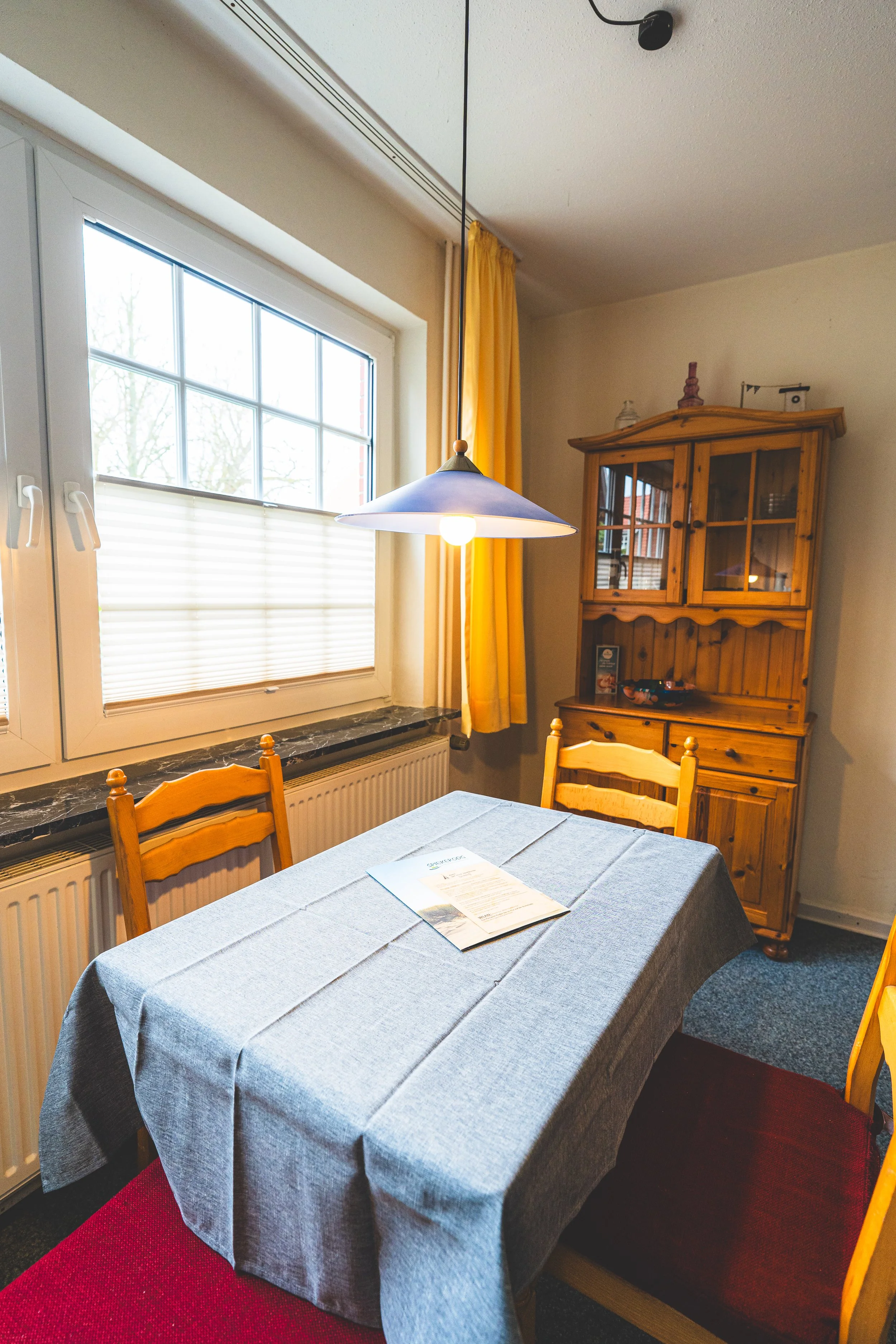 Unsere liebevoll eingerichtete Ferienwohnung bietet auf kompakter Fläche alles für einen entspannten Aufenthalt. Der helle Wohn- und Essbereich lädt mit großem Fenster und gemütlicher Atmosphäre zum Verweilen ein. Hier befindet sich ein hochwertiges, graues Verwandlungssofa mit ausgezeichnetem Schlafkomfort – ideal für zusätzliche Gäste.