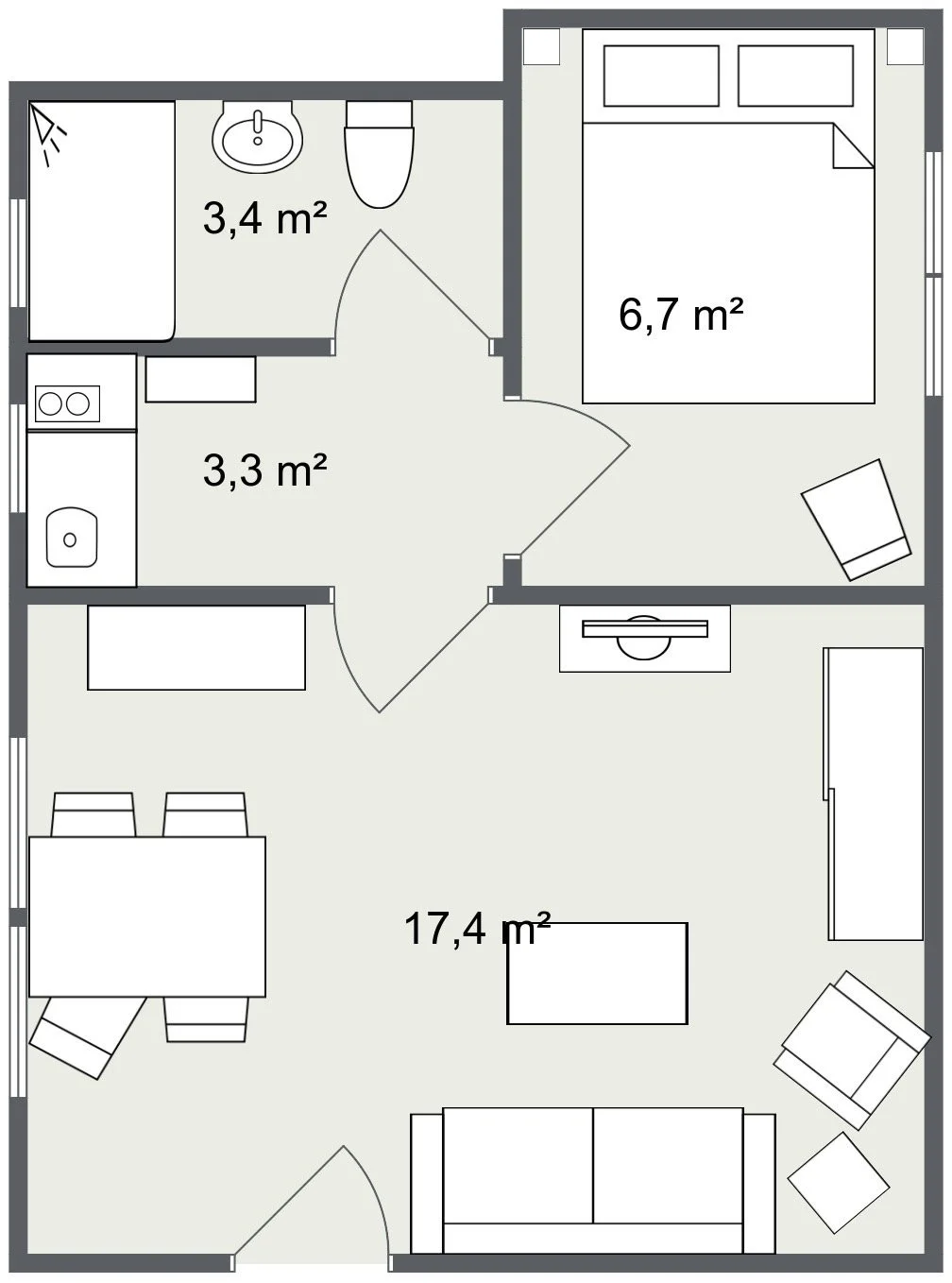 Die separate Küche ist funktional ausgestattet und bietet alles, was man für die Zubereitung kleiner Mahlzeiten benötigt. Das Schlafzimmer verfügt über ein komfortables Doppelbett ohne Fußteil, das für mehr Bewegungsfreiheit und einen angenehmen Schlaf sorgt.