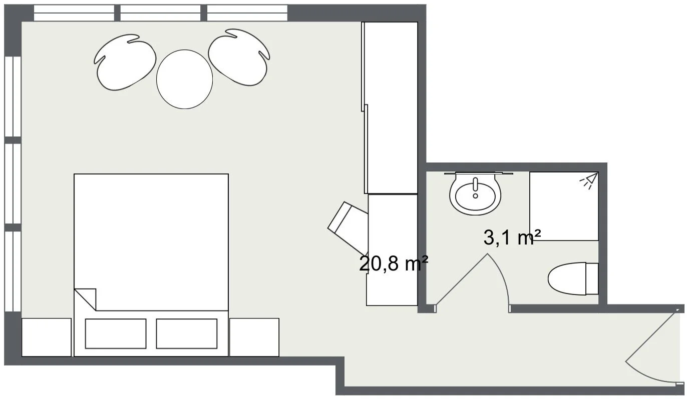 Durch seine großzügigen Fenster wirkt das Zimmer besonders luftig und weitläufig, während die schlichte Einrichtung für eine angenehme Klarheit sorgt.