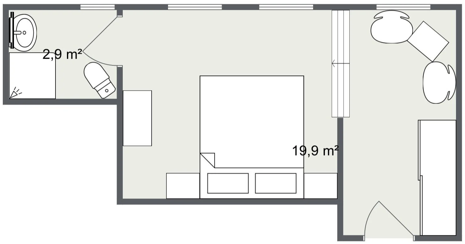 Große Fenster lassen viel Licht in den Raum und schaffen eine offene, helle Stimmung. Gleichzeitig bietet die Sitzecke einen ruhigen Platz zum Lesen, Unterhalten oder einfach zum Abschalten.
